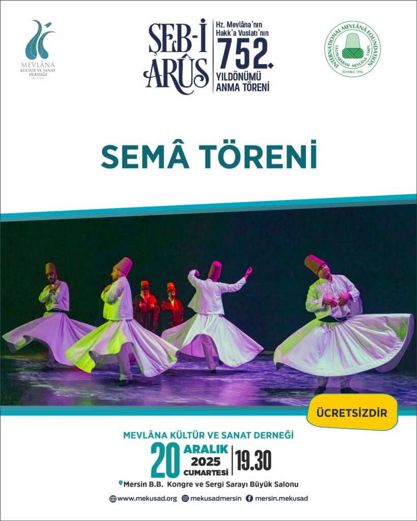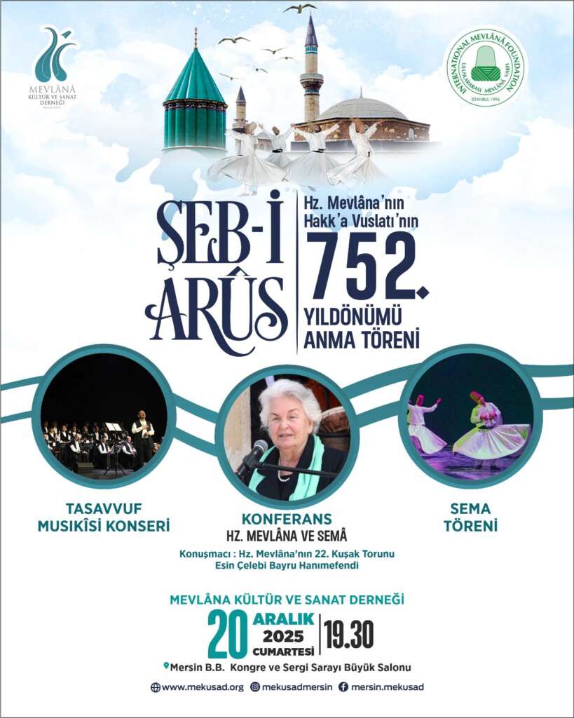 Mevlânâ Kültür ve Sanat Derneği Tasavvuf Mûsıkîsi Korosu’nun konseriyle başlayıp sonrasında Hz. Mevlânâ’nın 22. Kuşak Torunu Sn. Esin Çelebi Bayru Hanımefendi’nin konferansıyla devam edecek etkinliğimiz Acemaşiran Mevlevi Ayin-i Şerif-i’nin icra edileceği Semâ Töreni ile son bulacaktır.